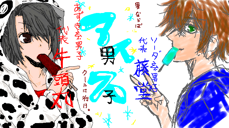 次は何描こうってなって御題を決めてやることに。んでまーちゃんが「アイス男子」といったので、ならばぬら孫の牛頭丸と薄桜鬼の平助で声優さんつながりで描こうってことで描きましたwwwww